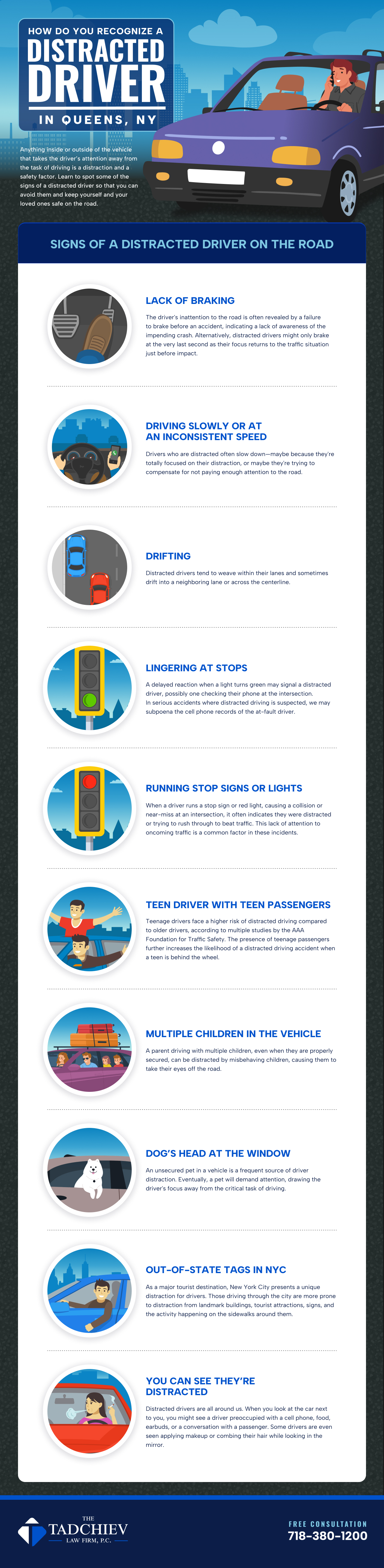 Distracted driving is the No. 1 contributing factor to car crashes in New York State, the New York Governor’s Traffic Safety Committee says. At The Tadchiev Law Firm, P.C., we are committed to helping people who have been injured in car accidents caused by distracted driving in Queens, NY. Our car accident attorneys can help you seek the compensation you need for medical bills, lost income, and other losses you have suffered in a distracted driving accident.